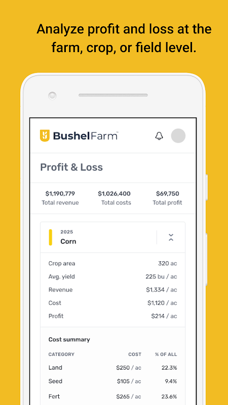 Buhel Farm trasforma i dati in informazioni come il costo di produzione, la posizione della granella e i profitti e le perdite a livello di campo o di coltura, semplificando la pianificazione e la condivisione con i partner di fiducia.