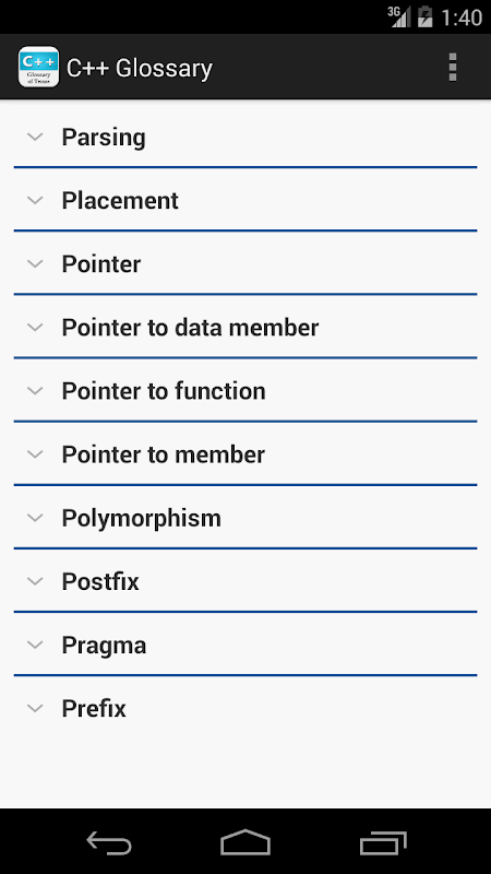 Questa applicazione fornisce una descrizione di tutti i termini importanti del C ++.