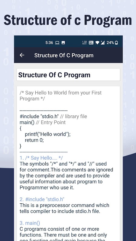 Stai trovando un'app di apprendimento della programmazione C senza soluzione di continuità, questa app di apprendimento C è piena di tutte le basi del linguaggio C per principianti. Sarai in grado di gestire o superare qualsiasi tipo di conseguenza del linguaggio C. Se ti presenti per un colloquio di programmazione C, l'app di apprendimento C è un'app indispensabile per te. Quando inizi questa app in linguaggio C, la codifica non richiede una conoscenza preliminare della programmazione e questa app per l'apprendimento C è perfetta per i principianti che vogliono imparare a programmare e fare carriera nel campo dello sviluppo IT. Il linguaggio di programmazione C è un linguaggio di programmazione molto potente che ha una vasta gamma di sviluppo di applicazioni.