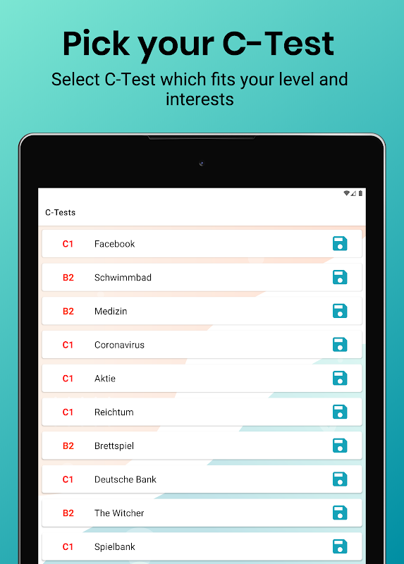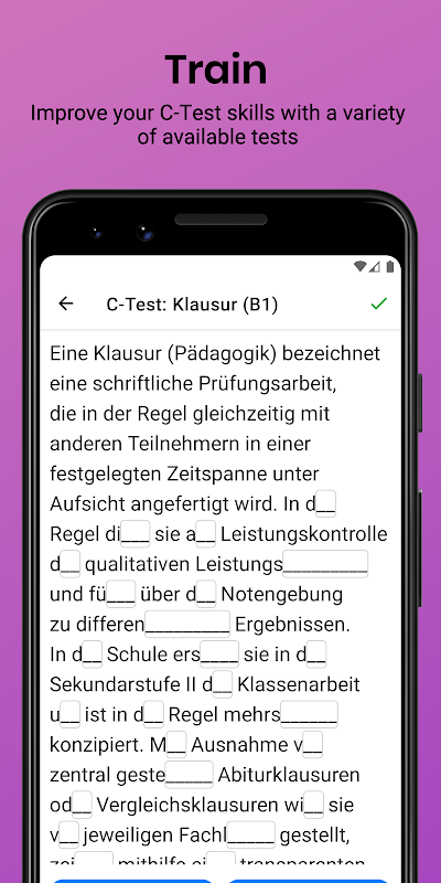 - 🏋️ Allena le tue abilità di C-Test esercitandoti con la varietà di C-Test disponibili sulla piattaforma o con i tuoi C-Test creati localmente