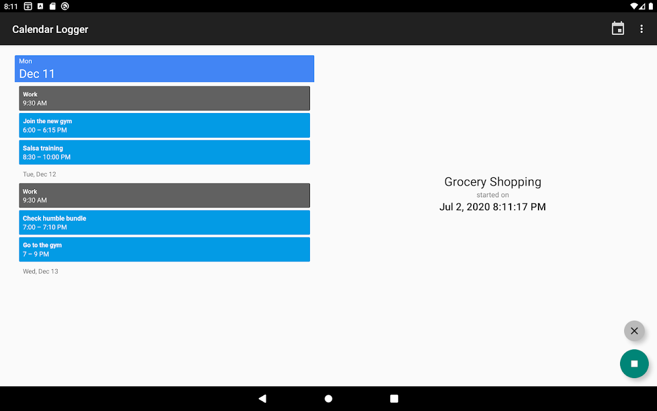 Tap one button when your activity starts, tap again when it ends. And your activity is now tracked in your Calendar application.