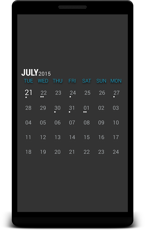 Calendar komponent for Kustom. Fully adjustable colors, fonts and sizes. Shows 1 to 5 rows. Days of the week, month, year optional. You can choose to have dots, squares, triangles or rectangles as appointment reminders. Up to four every day. You can scroll through the calendar. if you want to get back to the current date just click on the current day.