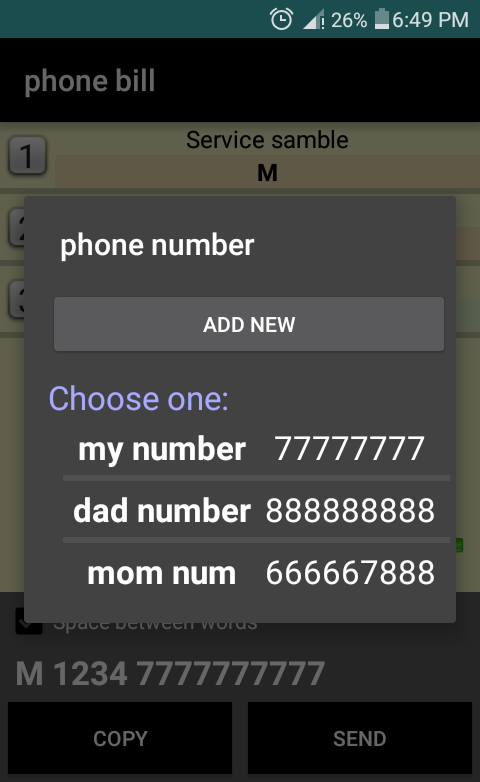 Ci sono molti servizi mobili USSD / SMS quali la fatturazione, ottenere informazioni, mobile banking o di sottoscrizione sono contenuti frammenti complessi così difficile da ricordare. Questa App aiuta a organizzare i servizi di chiamata / SMS. Scrivi il tuo chiamate / SMS con l'aggiunta di frammenti, testi, simboli, numero di servizio o qualsiasi cosa che si desidera per la prima volta e poi usarlo quando è necessario