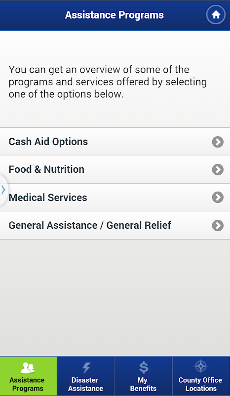 L'applicazione mobile permette di controllare le vostre prestazioni correnti ovunque voi siate, ogni volta che vuoi. Ottenere informazioni sui programmi di assistenza. Trova un ufficio della contea Servizi Umani nella vostra zona. Oppure, se un disastro è stato dichiarato nel codice di avviamento postale.