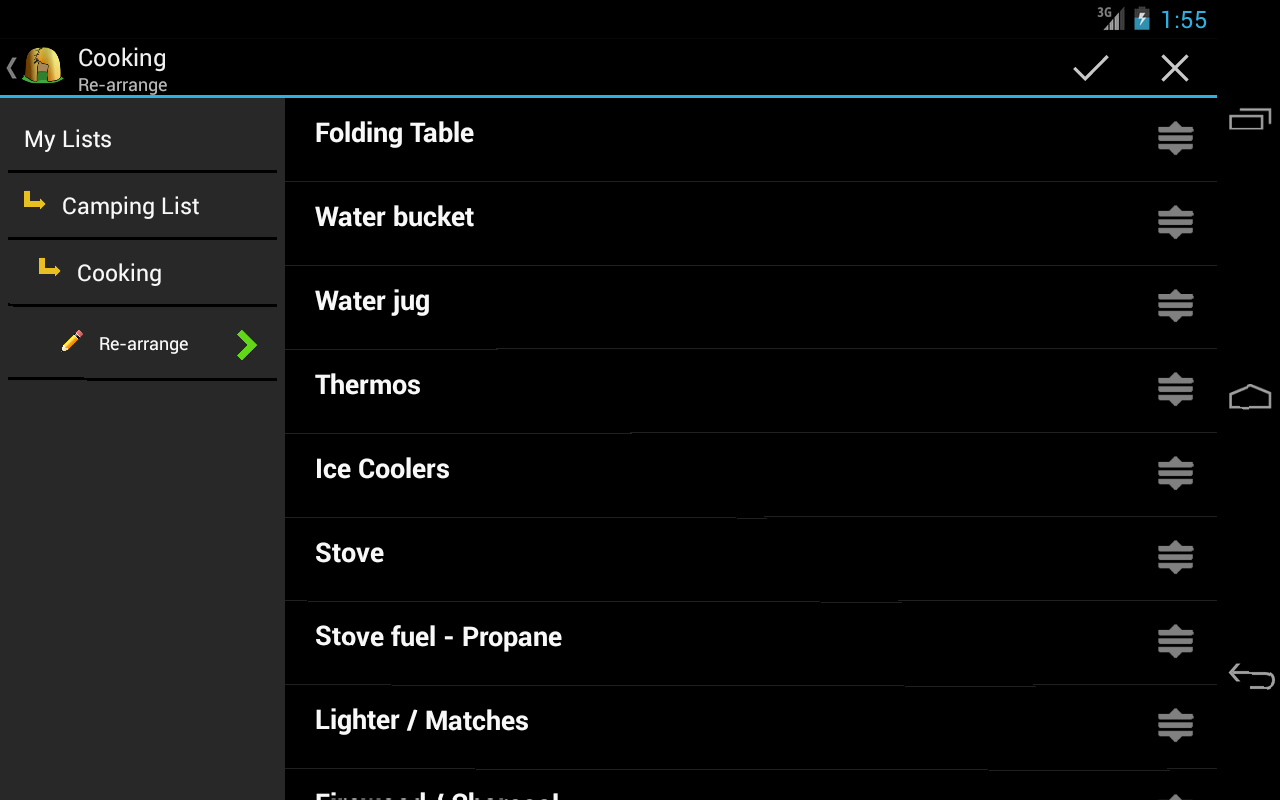 Con le opzioni per aggiungere / modificare / cancellare / copiare / spostare / riordinare / ordinamento automatico e duplicare è possibile personalizzare rapidamente la lista comunque si desidera. Con il supporto per più liste - sentitevi liberi di creare liste per i vari tipi di viaggi di campeggio - viaggi brevi / lunghi viaggi etc.