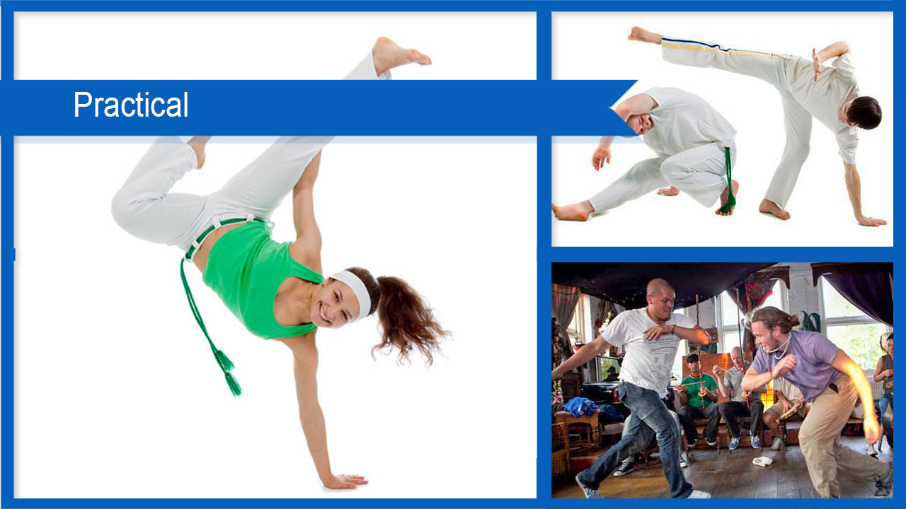 Capoeira touches many fields of fitness, skill work, and movement quality that could be distilled for the purposes of the second group, without the actual practice of the Capoeira basics, which are required for becoming a legitimate practitioner of the art form and body language.