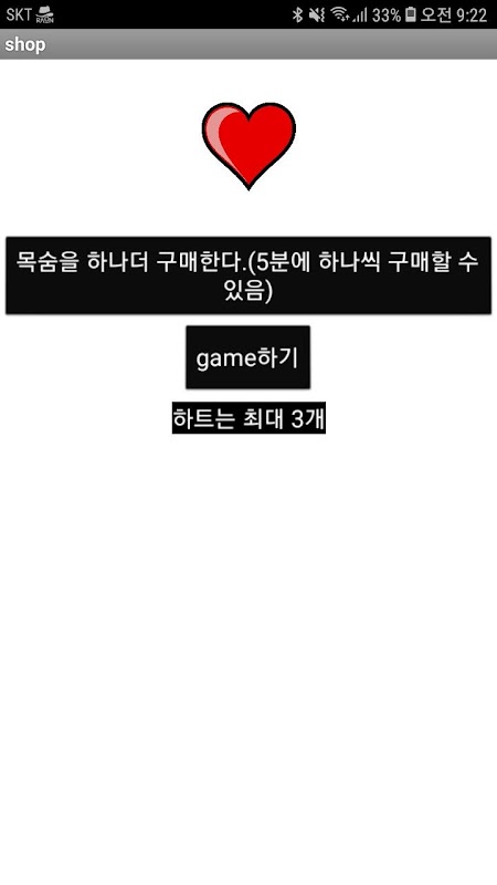 그걸 누르시면 들어갈 수 있는데 그러면 세개의 버튼과 shop먼저 들어가세요 라는 문구가 보입니다.그 문구의 존재이유는 내가 생각하고 고로 존재를 만들었기 때문이다.이런 말이 나온 이유는 만약 악마가 우리를 조종한다면 우리는 그걸 어떻게 인지할 수 있냐하면....쓸데없는 얘기 그만두고 다시 본론으로 가면 shop부터 가라는 이유는 안 그러면 안 되기 때문이다.그니까 하트를 5분에 하나 구매할 수 있는데 (그니까 너한테 이득이다) 돈은 5분에 하트 하나를 살 수 있게끔 주어진다. 그래서 shop버튼을 먼저 누르고 game하기를 눌러서 게임을 하고 하트 수 만큼 부딪히면 게임이 끝나고(아 참고로 무적자리에는 10초 이상 있으면