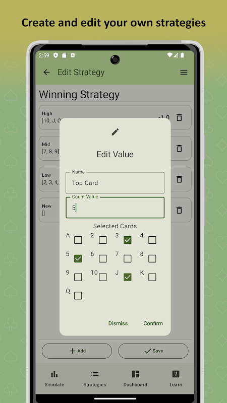 🧠 Strategie professionali e personalizzate: utilizza il metodo Hi-Lo standard del settore fin da subito o aggiungi i tuoi sistemi personalizzati per adattarli al tuo stile di gioco.