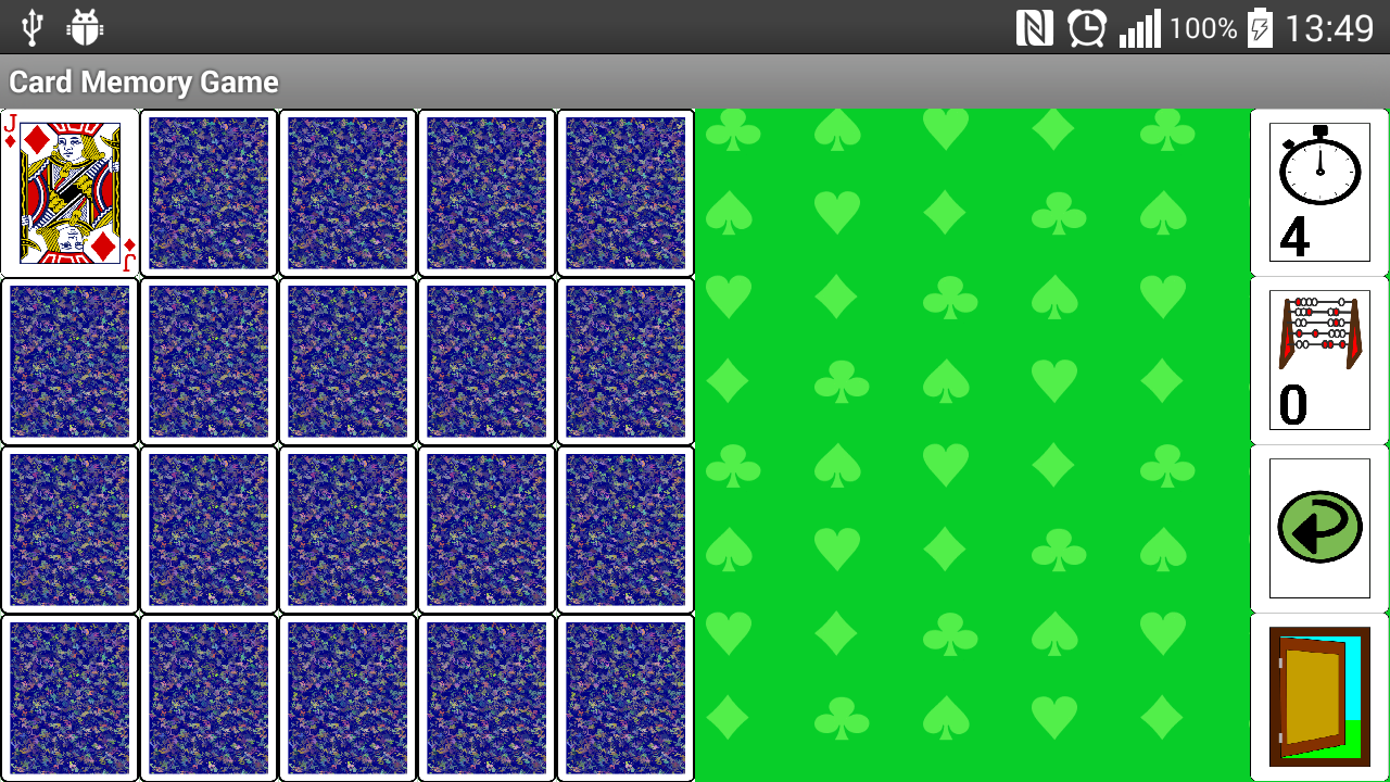 Card Memory Game is a card game in which cards are laid face down on a table and two cards are flipped face up on each turn. The object of the game is to turn over pairs of matching cards. The game is also known as Memory or Pairs. In our version of the game player can use decks of 20 or 32 playing cards. Cards are laid face down in four rows of five or eight cards each. In each turn player chooses two cards and turns them face up. If they are of the same rank and color (ace of hearts and ace of diamonds, king of clubs and king of spades, …) player wins the pair and cards are removed from the table. The game ends when the last pair is picked up. Time is recorded and added to leaderboard.