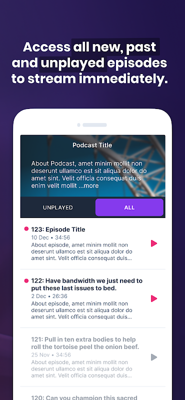 - Visualizza i nuovi episodi non riprodotti e quelli che hai già ascoltato.