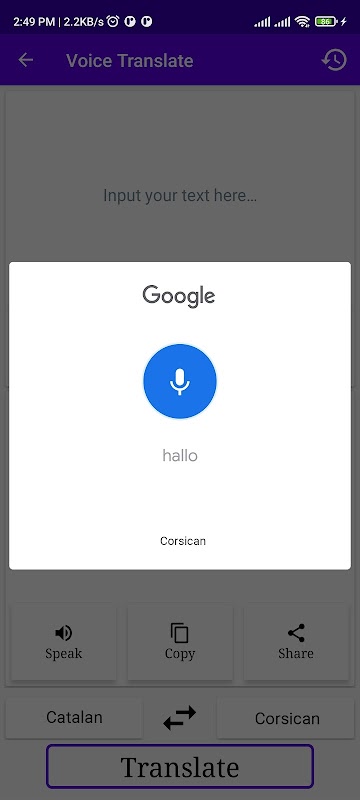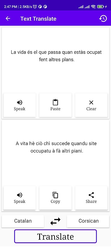 Il traduttore dal catalano al corso consente agli utenti di parlare e tradurre la voce in testo (digitazione vocale). Quindi il traduttore vocale automatico riconoscerà in modo rapido e accurato l'input vocale dell'utente, tradurrà direttamente nella lingua impostata e leggerà il risultato della traduzione ad alta voce tramite la funzione testo-voce. Questa funzione per tradurre il testo dalla tua voce come il corso o il catalano. Traduce anche il catalano in corso e il corso in catalano attraverso la tua voce. Questa applicazione ha anche ricevuto risposta dalla funzione Parla con testo. Inserisci semplicemente il testo desiderato e lascia che le parole catalano o corso parlalo ad alta voce per te. Puoi sentire la pronuncia corretta delle parole catalane e delle parole corse. Ti aiuta a migliorare il tuo parlato in catalano e corso. Ora puoi anche sembrare un madrelingua. Migliora il tuo vocabolario ora!.