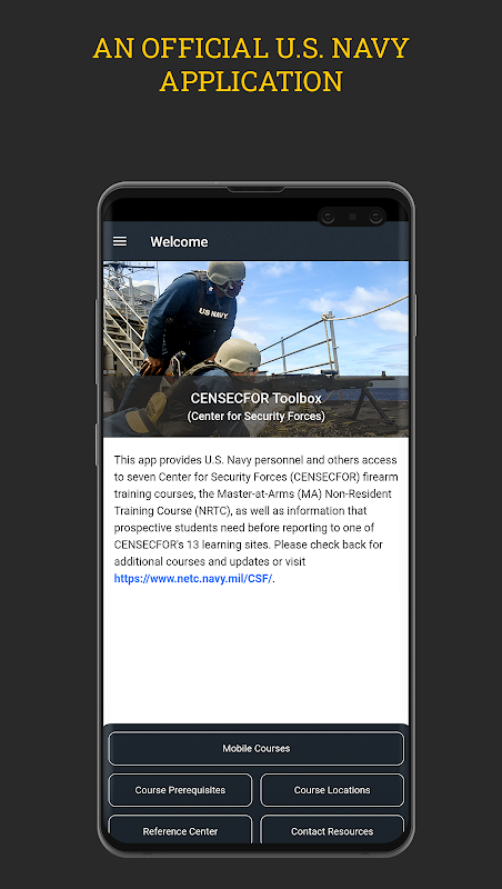 Il Toolbox del Center for Security Forces (CENSECFOR) fornisce accesso su richiesta a corsi di addestramento sulle armi selezionati e al nuovo manuale interattivo di addestramento sul tasso di Master-at-Arms (MA). L'app fornisce inoltre informazioni che gli studenti devono sapere prima di rivolgersi ai siti di apprendimento CENSECFOR.