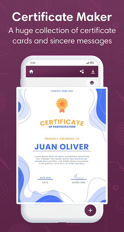 Nell'app del certificato Professional, puoi creare fantastici certificati e salvarli nella galleria del tuo dispositivo con qualità HD.