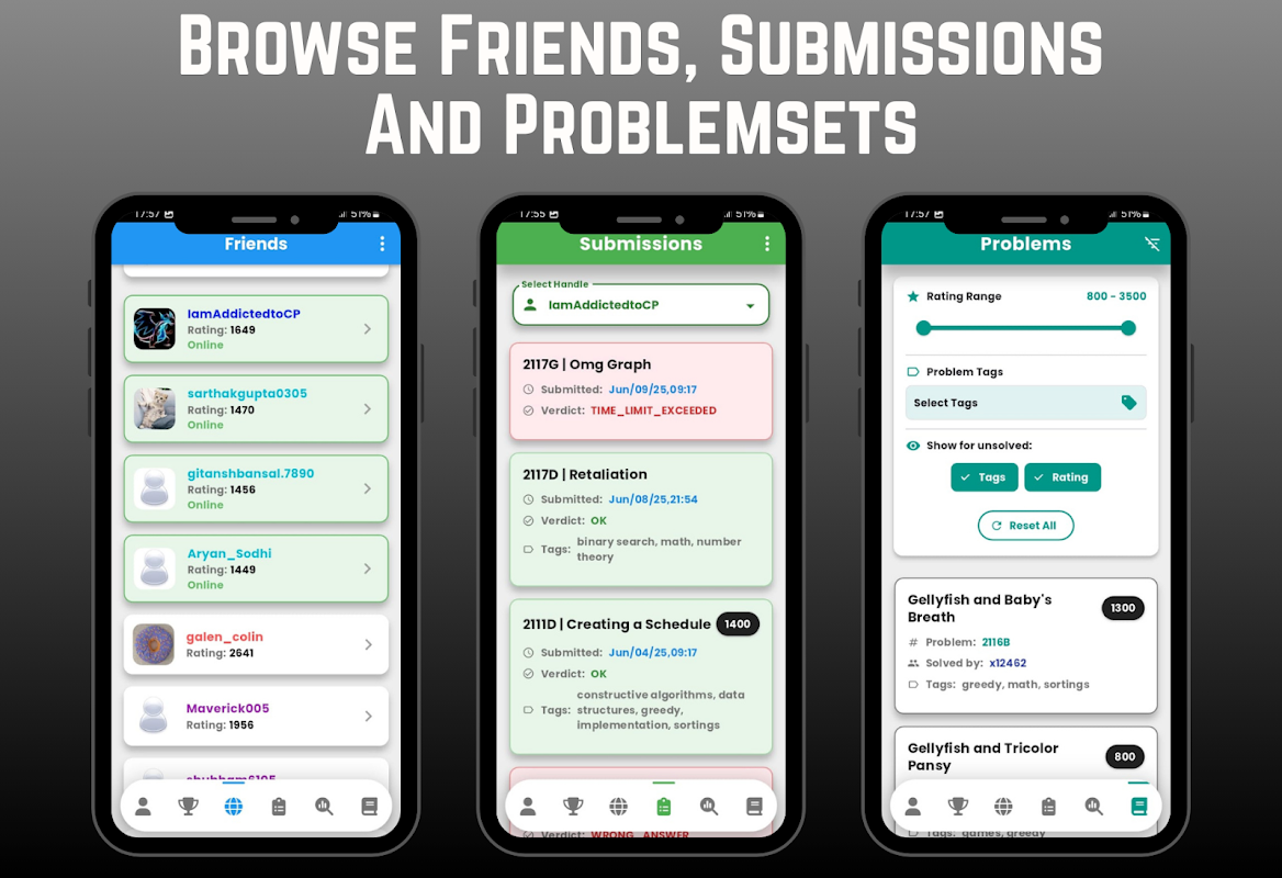 Mantieni il controllo della tua programmazione competitiva con CF Buddy, l'app completa di Codeforces progettata per aiutarti a migliorare in modo più rapido e intelligente!