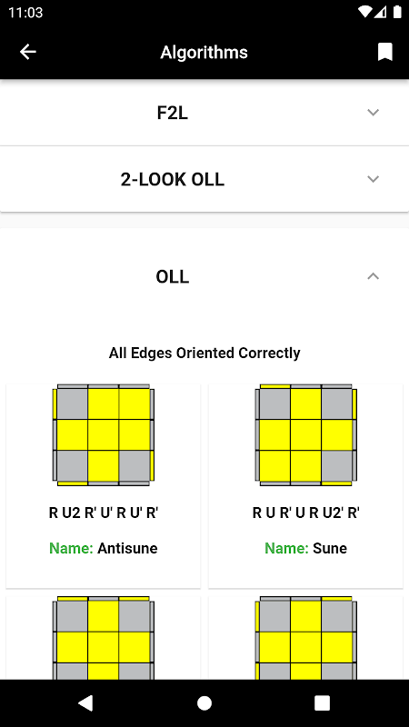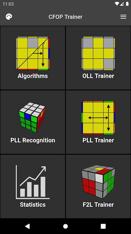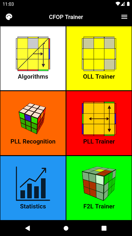 VivaLabs presenta CFOP Trainer, uno strumento per aiutarti a imparare e formare CFOP. Questa app ha un riconoscimento PLL su 2 lati, F2L, OLL, PLL, COLL e WV Trainer. statistiche e una tabella di riferimento per: 41 F2L, 57 OLL, 21 PLL, 41 COLL e 27 WV.