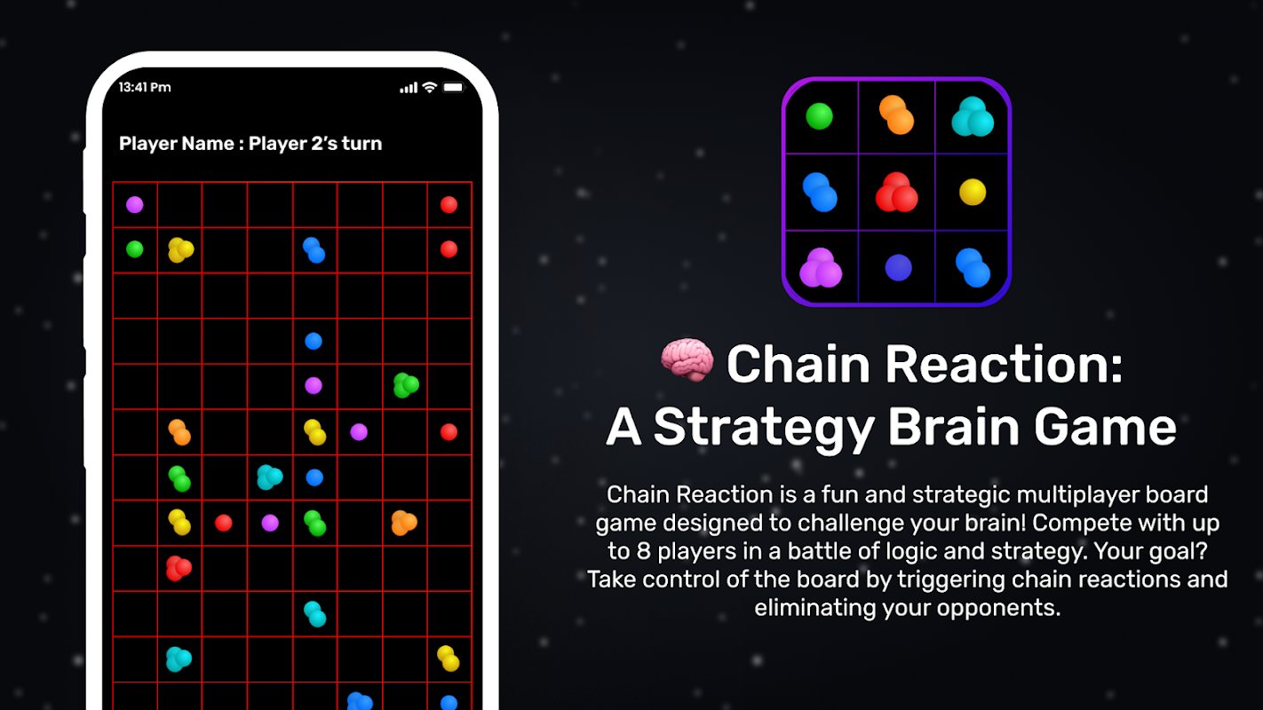 Chain Reaction è un gioco da tavolo multiplayer divertente e strategico progettato per sfidare il tuo cervello! Competi con un massimo di 8 giocatori in una battaglia di logica e strategia. Il tuo obiettivo? Prendi il controllo del tabellone attivando reazioni a catena ed eliminando i tuoi avversari.