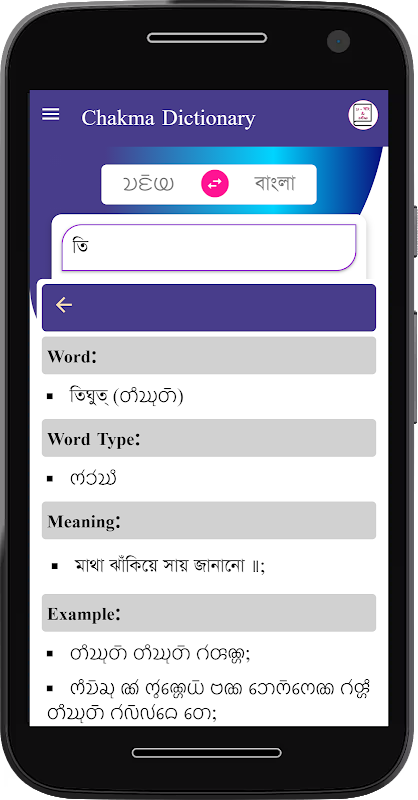 Il cuore dell'app è il suo ampio database, meticolosamente curato per includere una vasta raccolta di parole, frasi ed espressioni Chakma. Che tu sia uno studente alle prime armi o un oratore esperto che cerca di espandere il proprio vocabolario, il Dizionario Chakma è quello che fa per te. Con migliaia di voci a portata di mano, puoi cercare facilmente traduzioni, definizioni ed esempi di utilizzo contestuale, consentendoti di cogliere con facilità le sfumature della lingua.