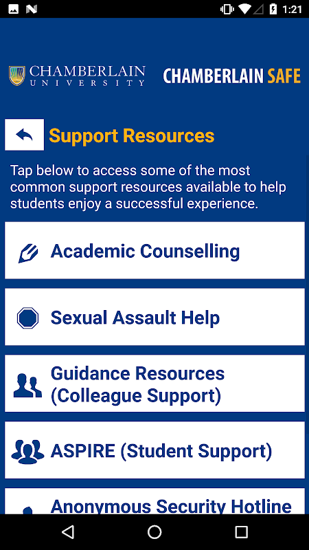 - Notifiche di sicurezza: ricevi notifiche e istruzioni istantanee dalla sicurezza della Chamberlain University quando si verificano emergenze all'interno del campus.