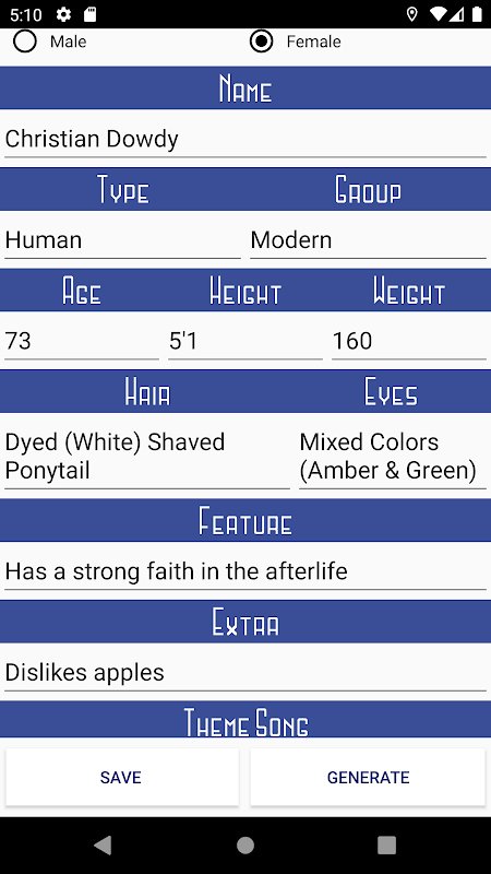 Character Generator & Designer ti permette di creare personaggi unici per le tue storie, i tuoi giochi e le tue avventure di gioco di ruolo. Che tu sia un autore, uno sviluppatore di giochi o un appassionato, questa app ti offre gli strumenti necessari per dare vita ai tuoi personaggi.
