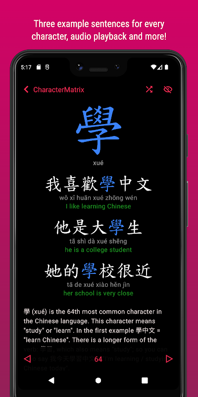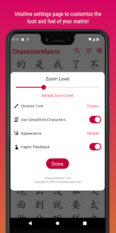 Questa app mostra i 1000 caratteri 中文 più utilizzati in una matrice che puoi regolare (livello di zoom, carattere, tema scuro/chiaro). La sua interfaccia utente semplice e pulita si adatta alle dimensioni del tuo dispositivo. Se lo usi sul tuo iPad puoi vedere più caratteri contemporaneamente o dividere lo schermo.