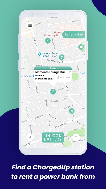 ChargedUp has created a station network for portable power bank. Rent a power bank and use it while at that venue, or take it with you and charge on the go. Power banks come with their own USB-C and Micro-USB ports, no need to have your own cable.