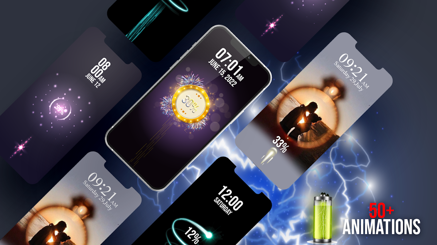 Più temi di ricarica per cellulari mostrano un brillante spettacolo di ricarica sulla schermata di blocco. Ottieni straordinarie animazione di ricarica rapida - schermo guantato con una grafica davvero accattivante per la ricarica della batteria. Anche questo all'interno della tua scelta di sfondi e colori del testo. Personalizzalo secondo la tua scelta. Guarda gli effetti fotografici di ricarica mentre carichi il tuo dispositivo e divertiti!