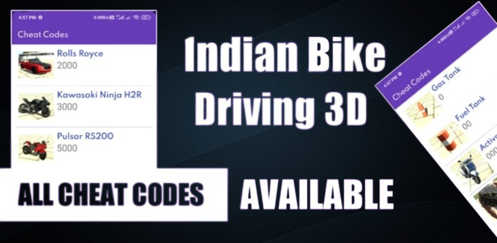 Indian bike driving 3d cheat codes app has new cheat codes for Indian bike driving 3d. This cheat code app lets you secure some pretty cool new vehicles for your game.