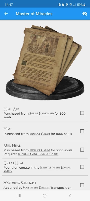 Puoi controllare il tuo gioco, i risultati, le armi / scudi, le armature e gli scambi. Tutti hanno collegamenti a DS Wikipedia.