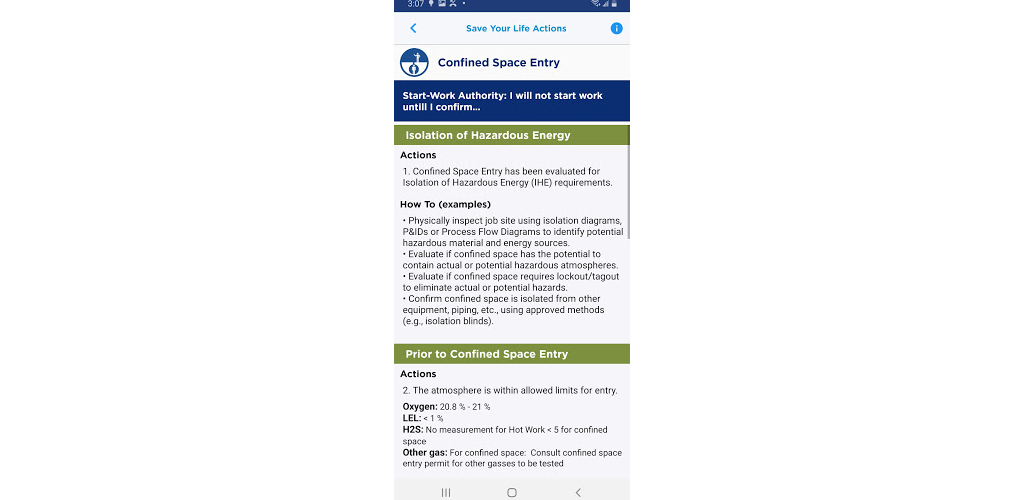L'app Chevron Start Work Checks è uno strumento di verifica mobile progettato per aiutare gli operatori sul campo a confermare che sono in atto misure di sicurezza adeguate e che le "azioni salvavita" vengono completate immediatamente prima dell'inizio delle attività lavorative. L'app supporta gli sforzi generali volti a eliminare gli infortuni gravi e prevenire gli incidenti mortali sul posto di lavoro.