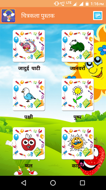इस ऐप में सभी प्रकार के जानवर, पक्षी, फूल, फल, कार्टून छवियां शामिल हैं ताकि आप विभिन्न रंगों वाली छवियों को रंग दे सकें।अंतिम दो आइकन "चित्रकला प्रतियोगिताएं विषय" और "त्यौहार" में क्रमशः सभी प्रतियोगिता विषयों और सभी भारतीय त्यौहार शामिल हैं, जिन्हें अक्सर चित्रकला प्रतियोगिता में कहा जाता है और इससे बच्चों के लिए ड्राइंग सीखने का आसान तरीका होता है|