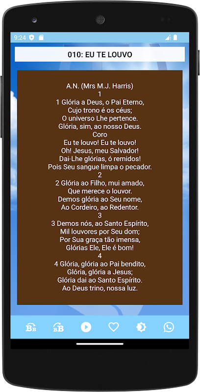 Potrai prendere il meglio delle lodi dell'Arpa Cristiana, avrai a disposizione tutti gli inni dell', per assistere nelle lodi e nell'accompagnamento con i testi degli inni, accordi e partitura per musicisti, e potrai scaricare l'audio degli inni o guardalo direttamente da YouTube Harp, oltre a scegliere i tuoi inni preferiti, condividere i testi degli inni e cercare gli inni per autore.