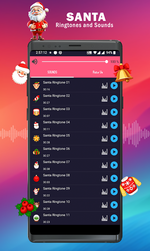 Santa Ringtone Songs per Android è un regalo unico per gli amanti delle canzoni di Natale. Imposta le suonerie di Babbo Natale come suoni di notifica, suonerie predefinite, toni di allarme e segnali acustici dei messaggi. È facile trovare le nuove suonerie dall'elenco Suoni di Babbo Natale e renderle i suoni della suoneria della canzone predefiniti.