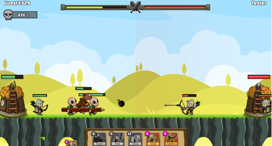 Clash of Goblins is real time strategy units deployment game. Objective is to destroy the opponent base by deploying the goblins. Try different combination of units to make effective attack force. Selecting the right units at appropriate time is best way to win the battle. Good Luck