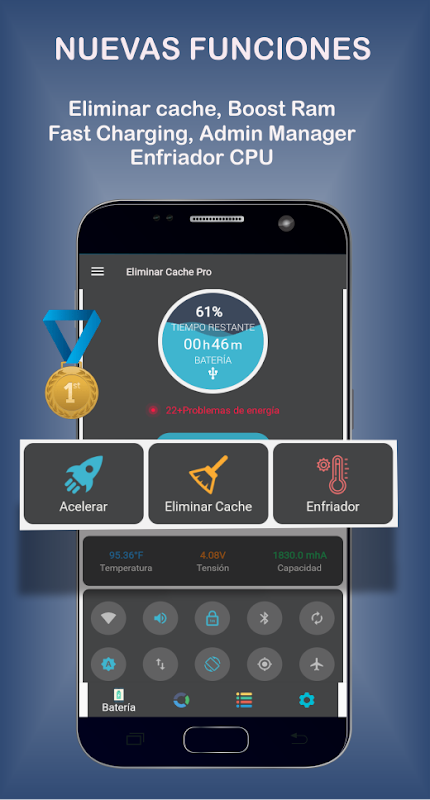 Eliminar cache y basura es el principal objetivo de esta aplicación en conjunto con otras funciones muy completas como ahorro de batería, acelerar ram, enfriamiento de batería y cpu.
