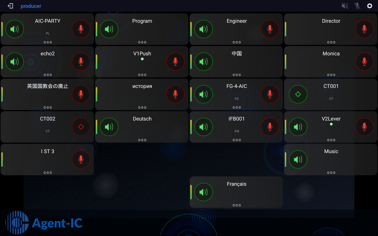 Agent-IC offre la stessa esperienza utente dei tradizionali pannelli intercomunicanti. Anche sul dispositivo mobile, l'app è dotata di funzionalità complete con chiamate punto-punto, chiamate di gruppo punto-multipunto, Partyline, comunicazioni IFB con attivazione logica, PTT (Push-to-talk), livello audio cross-point locale controllo e notifiche. Tutte le comunicazioni sono crittografate su AES.