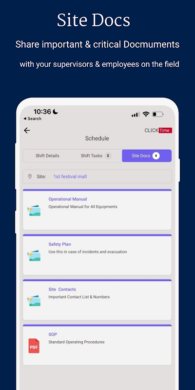 • Documenti del sito: visualizza documenti e allegati importanti del sito condivisi direttamente dall'app ClickTime.