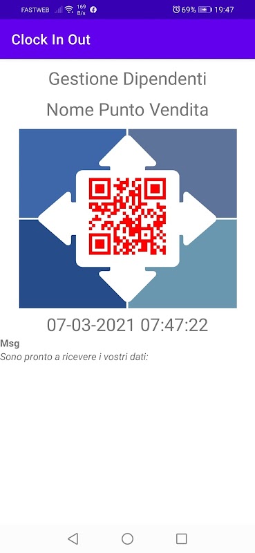 Si tratta di un'app Marcatempo che genera un qr-code ogni secondo, il qr-code generato viene acquisito dall'app Admin-Dipendenti che con una comunicazione client server trasmette all' app Marcatempo il codice dipendente. L'app Admin-Dipendente e L'app Marcatempo devono essere connessi sulla stessa rete.