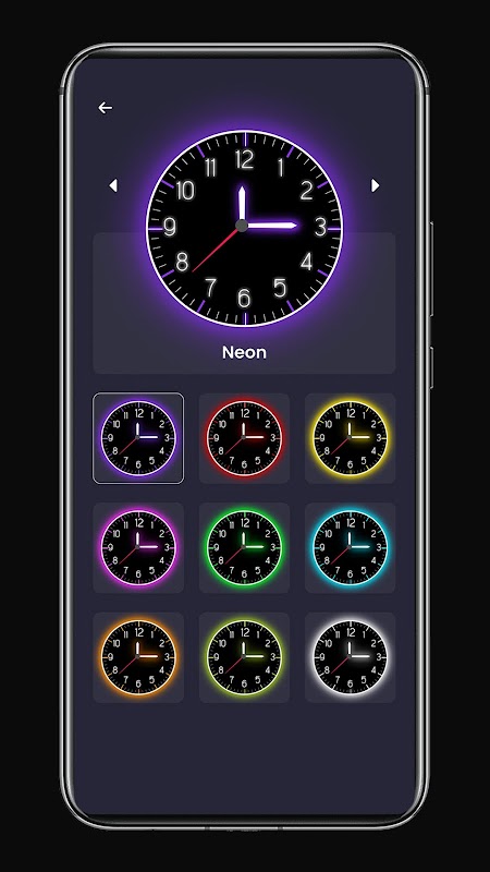 • Schermata di blocco orologio personalizzata: scegli tra diverse combinazioni di colori ed effetti al neon.