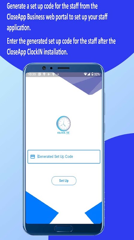 The business owner/manager generates a set up code on the CloseApp Business web portal which is use to set up the staff application after the installation.