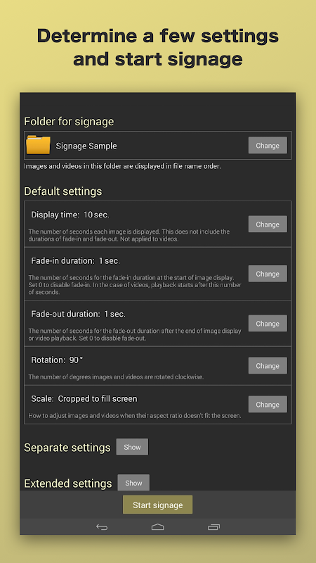 3. (Imposta valori come l'eventuale tempo di visualizzazione e) fai clic sul pulsante "avvia segnaletica" per avviare la visualizzazione di immagini e video nella cartella segnaletica.