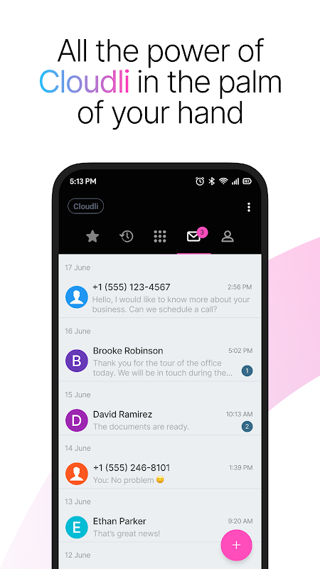 Invia un SMS o effettua una chiamata: a te la scelta. Invia messaggi di testo con clienti e clienti sulla tua linea aziendale o alza il telefono per una connessione vocale di alta qualità. Con Cloudli Connect godrai della massima flessibilità di comunicazione.