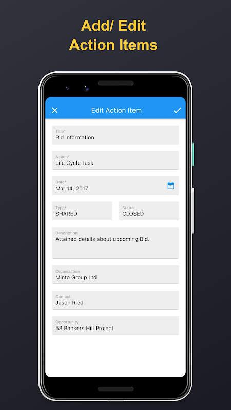 CMiC Opportunity Management (OM) per dispositivi mobili offre una ricca esperienza CRM per i professionisti dell'edilizia su smartphone e tablet. Concedi ai tuoi utenti sul campo l'accesso a informazioni preziose in tempo reale, indipendentemente da dove si trovino, per rimanere in contatto con clienti e potenziali clienti e prendere decisioni importanti durante il processo di vendita. I dirigenti delle vendite, dello sviluppo aziendale e del marketing possono accedere facilmente a opportunità, organizzazioni, contatti e elementi di azione mentre sono in movimento.