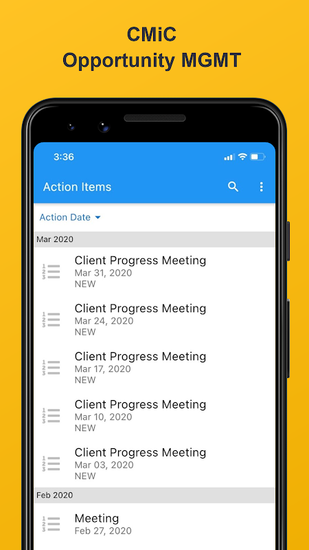 L'istanza mobile consente agli utenti di avere la massima flessibilità per immettere e / o aggiornare le informazioni sui potenziali clienti tramite dispositivi Android o iOS, con la possibilità di eseguire query, cercare, ordinare e filtrare i record in un unico posto. Con CMiC OM per dispositivi mobili, puoi gestire le tue vendite in movimento e i cicli di vendita in modo efficace.