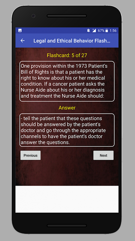 L'app CNA Practice Test è un'app flashcard e quiz gratuita per prepararti a un test di certificazione CNA. Contiene domande dal test CNA effettivo svolto nel 2015, 2016, 2017, 2018, 2019 e 2020. Un Assistente infermieristico certificato (CNA) è qualcuno che fa parte del team sanitario. Lavora sotto la supervisione di un'infermiera registrata (RN) o di un'infermiera pratica autorizzata (LPN). Esistono diversi termini utilizzati per CNA. Alcuni di essi sono Nursing Assistant (NA), Patient Care Assistant (PCA) o State Tested Nurse Aid (STNA).