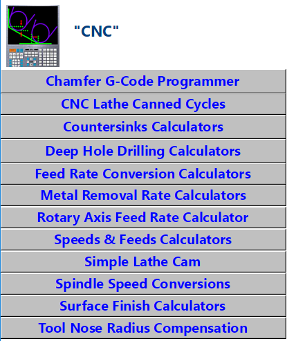 CNC Lathe Fanuc Canned Cycles G76 G71 G70 G90 G94 Descriptions and more! Web Machinist Mobile Pro® has many calculators for CNC Machinists, Programmers and QC Inspectors. Including Calculators for Angles, CNC Applications, CNC Lathe Fanuc Canned Cycles, Simple Lathe Cam CNC Lathe Tool Nose Compensation G-Code Calculators, Chamfer G-Code Calculators, Metric Conversions, Countersink Depth Calculators, Center Drill Depth Calculators, General Conversions, CNC Drilling, CNC Mill & Lathe Deep Hole Drilling calculators, Dovetail Measuring Calculators, Blueprint Symbols, G Codes, M Codes, Machining Formulas and calculators, Spindle speed and feed rate formulas and calculators, circle solving formulas, Hole Patterns, Hole Array Patters including full circle and partial circle patterns, 3 Wire Threads Pitch Diameter Measuring Calculators for Unified Threads, Metric Threads, Acme Threads and Metric Trapezoidal Threads, CNC Lathe Tool Nose Radius compensation calculators, QC Inspection, Manual Machining, Metal Removal Rates, CNC Milling, Reference, Rotary Axis, Speeds & Feeds, Imperial and Module Spur Gear Dimensions Calculators, CNC Tapping, CNC Threading, Manual Lathe Calculators, Unified Threads, Metric Threads, Acme Threads, Metric Trapezoidal Threads, Spur Gears, Module Spur Gears, Imperial Spur Gears, Area Calculators, Triangles, Circle Calculators, Mill Machine Tooling, Collets dimensions, Keyseat Cutters Calculators, Trigonometry Calculators, Hole Pattern Calculators, Wheel Bolt Pattern Calculators, Manual Mill Calculators, Tooling & Hardware, Sine Bar and Compound Sine Plate calculators, Trigonometry & Geometry, Shop Math Calculators, Lathe Spindle Speed Calculators, CNC Tapping Speeds Calculators, Surface Roughness Calculators, Drilling Speeds Calculators, Tapping Speeds Calculators, CNC Turning and Miscellaneous Calculators. This is a Must Have APP for Machinists, CNC Machinists, Machine Shops, QC Inspectors, CNC Set-up Operators, CNC Programmers.