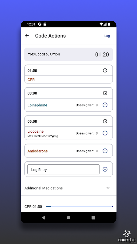 I tempi per la RCP e i comuni farmaci ACLS sono inclusi con promemoria visivi e acustici per aiutare a scaricare cognitivamente queste attività. Inoltre, una funzione di registrazione automatizzata consente di registrare accuratamente ogni fase di una rianimazione. I registri possono essere copiati negli appunti a scopo di documentazione. Eventuali farmaci, interventi e dosi richiesti dall'applicazione Code Blue Leader riflettono quelli raccomandati dalle linee guida ACLS dell'American Heart Association (AHA) più aggiornate.