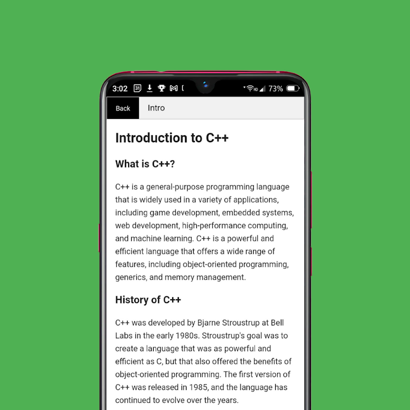 Benvenuto in "CodeCraft C++", la tua via d'accesso per padroneggiare il linguaggio di programmazione C++, aprendo al contempo la strada a un futuro pieno di infinite possibilità di programmazione. Che tu stia appena iniziando il tuo viaggio nella programmazione o stia cercando di espandere le tue capacità di programmazione, questa app è la tua compagna fidata nel tuo percorso per diventare un esperto sviluppatore C++.