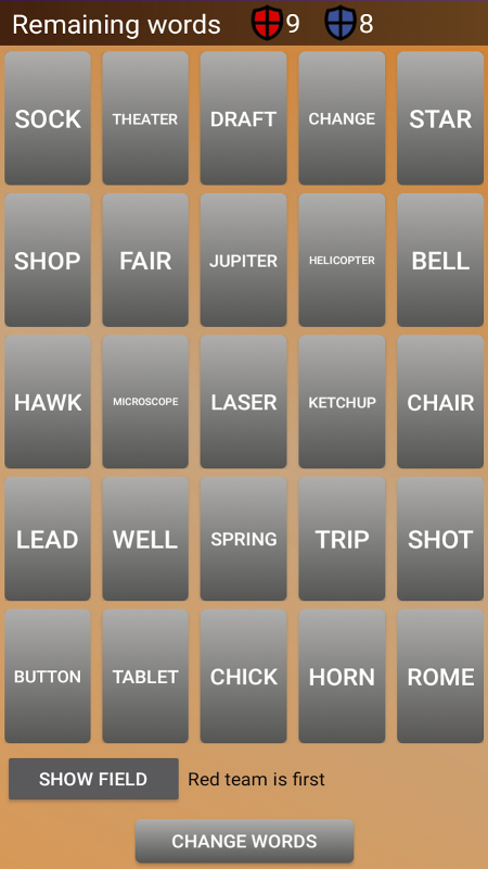 In the game, you need to split into 2 teams - red and blue, and guess the words of your team as quickly as possible.