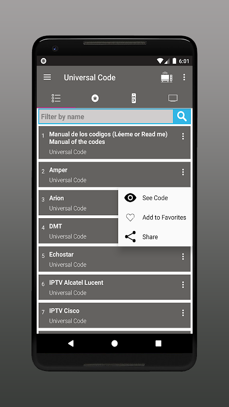 Los códigos del controlador remoto de tv universal esta app te permite seleccionar rápidamente miles de códigos de fabricantes de tv para que pueda configurar su mando o (control) para la televisión.