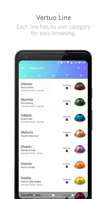 • dettagli su ogni capsula (profilo aromatico, intensità, origine)